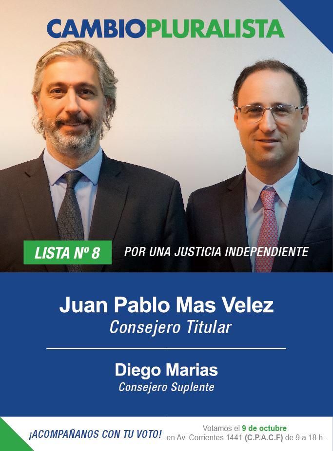 Juan Pablo Mas Velez es abogado y vicerector de la UBA-Derecho oriundo de una familia del seno judicial y es candidato a consejero titular por la Lista 8 de Cambio Pluralista junto al candidato suplente, Diego Marías.
