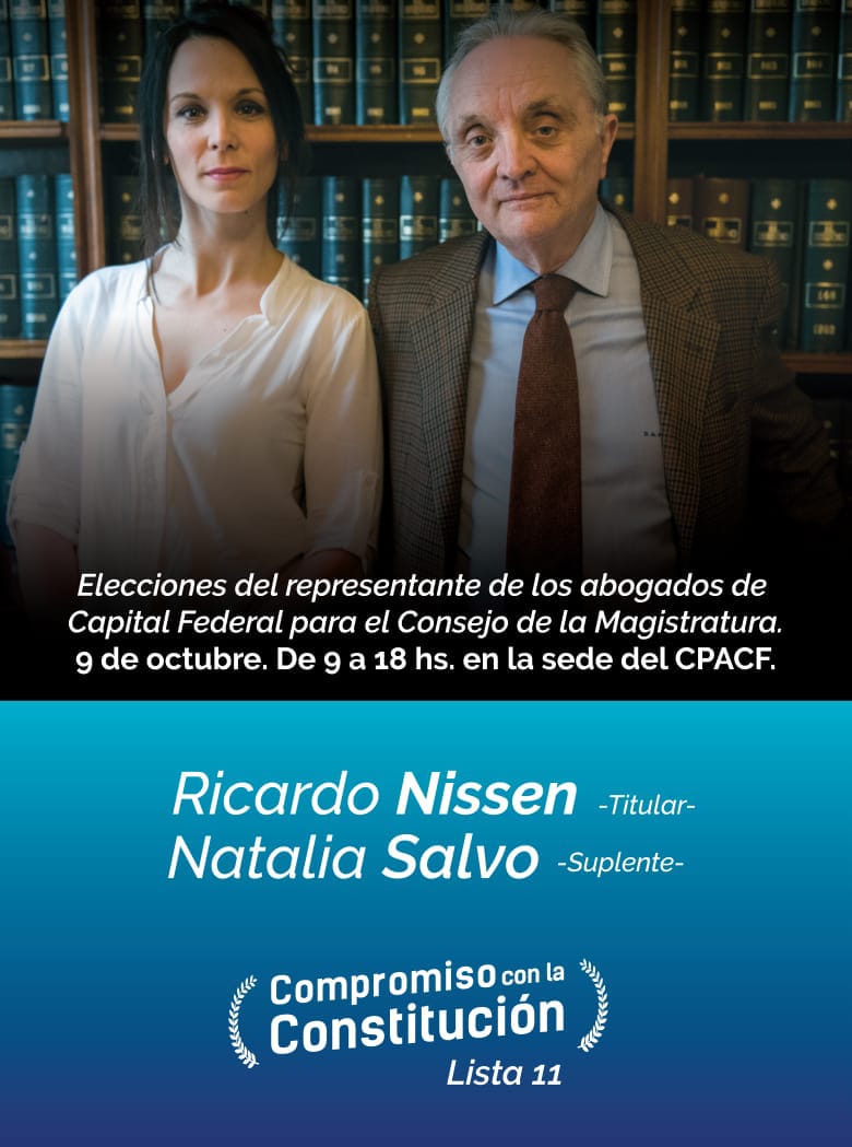 El experto abogado, Ricardo Nissen, y la joven abogada, Natalia Salvo, integran la Lista 11 "Compromiso con la Constitución" como consejeros titular y suplente para la próxima conformación del Consejo de la Magistratura de la Nación por el estamento de los abogados de la Capital Federal. Te compartimos la entrevista con Tiempo Judicial.