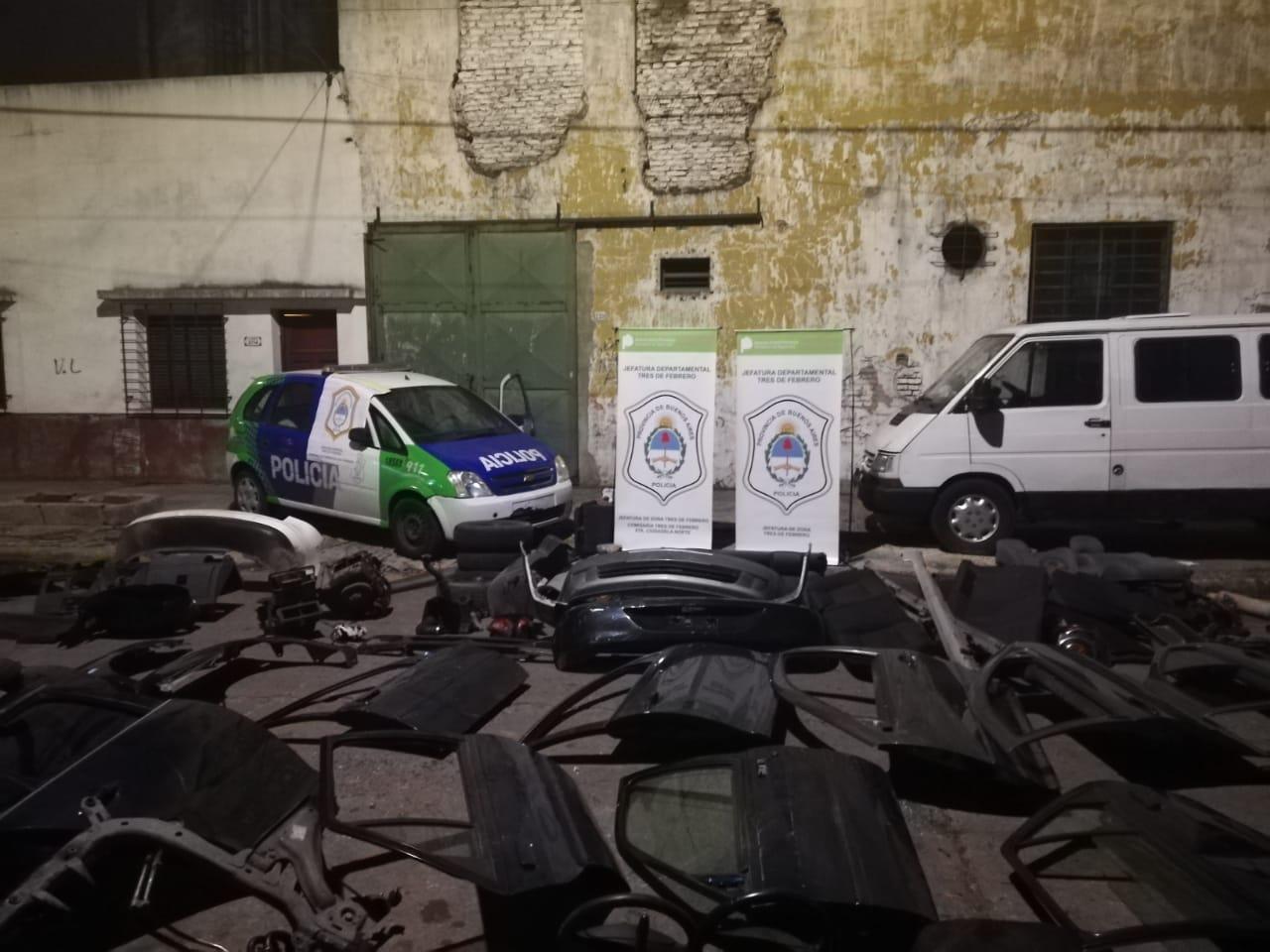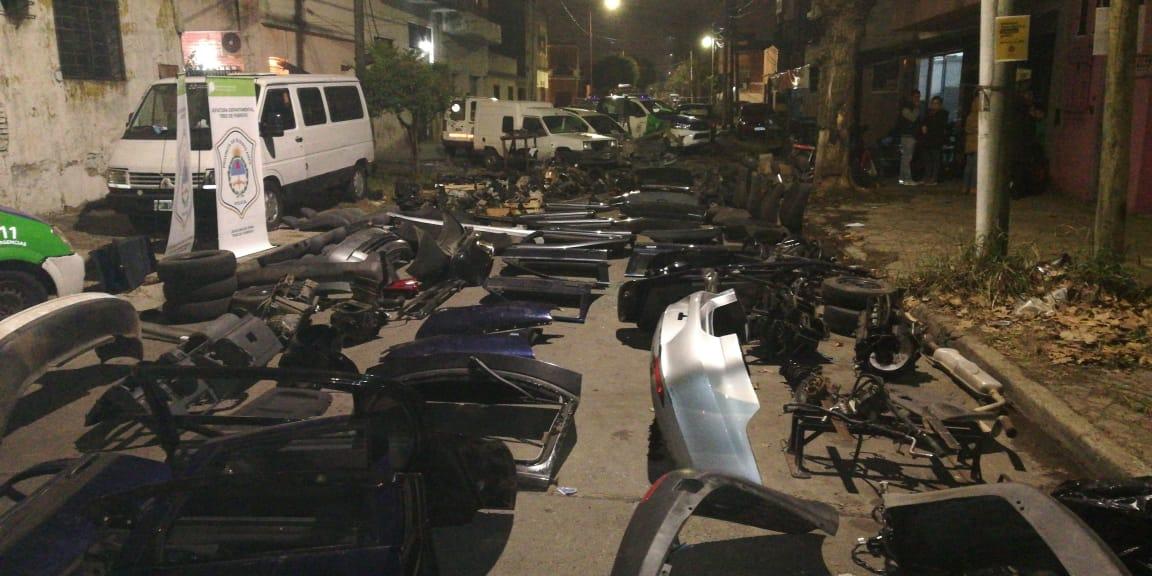 El operativo se llevó a cabo en un galpón ubicado en calle La Merced al 2732 de la mencionada localidad oeste del conurbano, donde los efectivos apresaron a los dos implicados, de 27 y 52 años, y secuestraron cuatro automóviles  con pedido de secuestro activo (VW Surán, Bora, Renault Express y Ford Fiesta) totalmente desmantelados y gran cantidad de autopartes (puertas, paragolpes, capots y demás elementos de interés para la investigación.