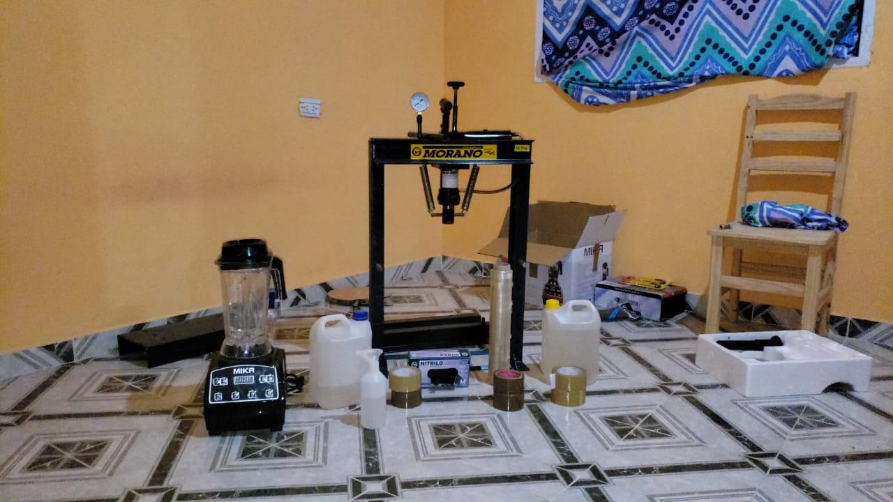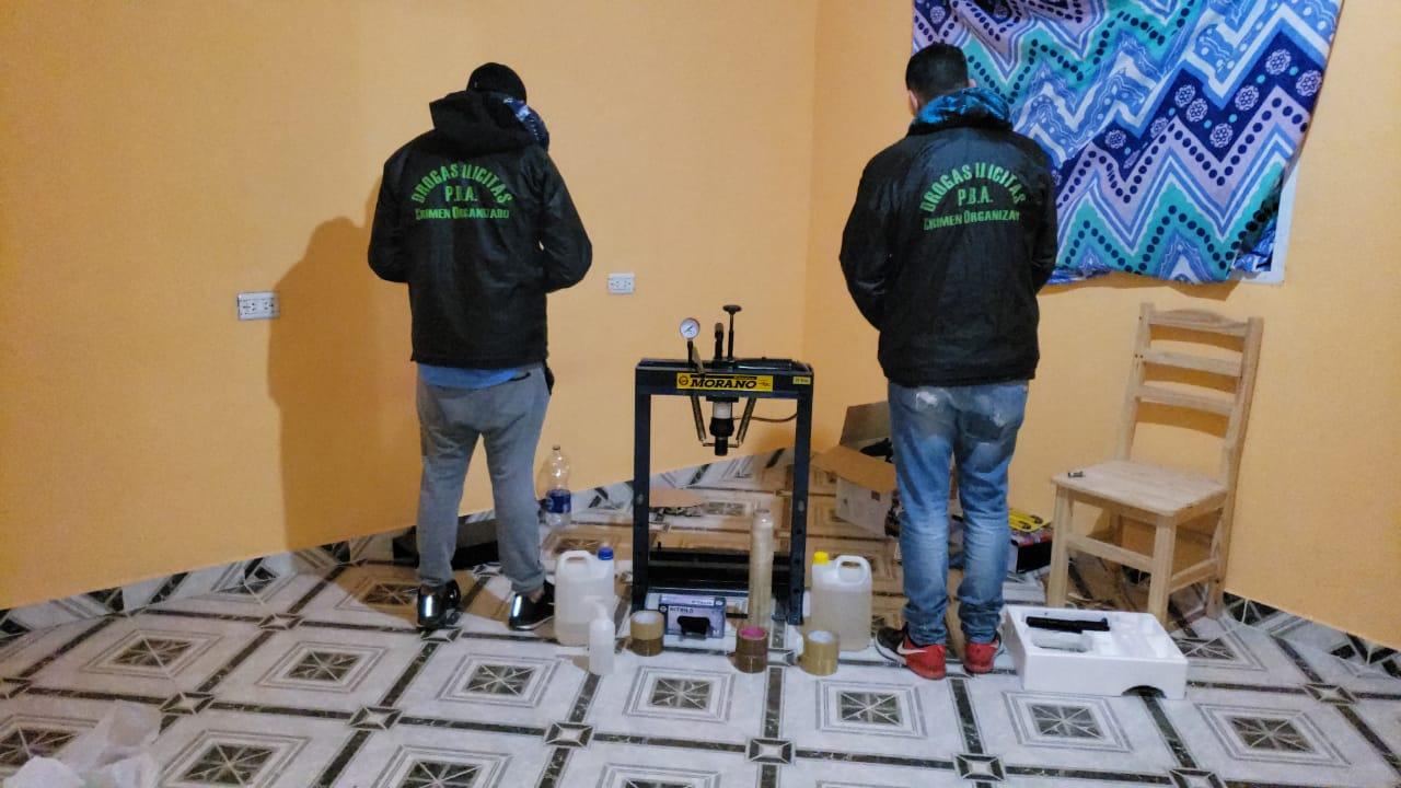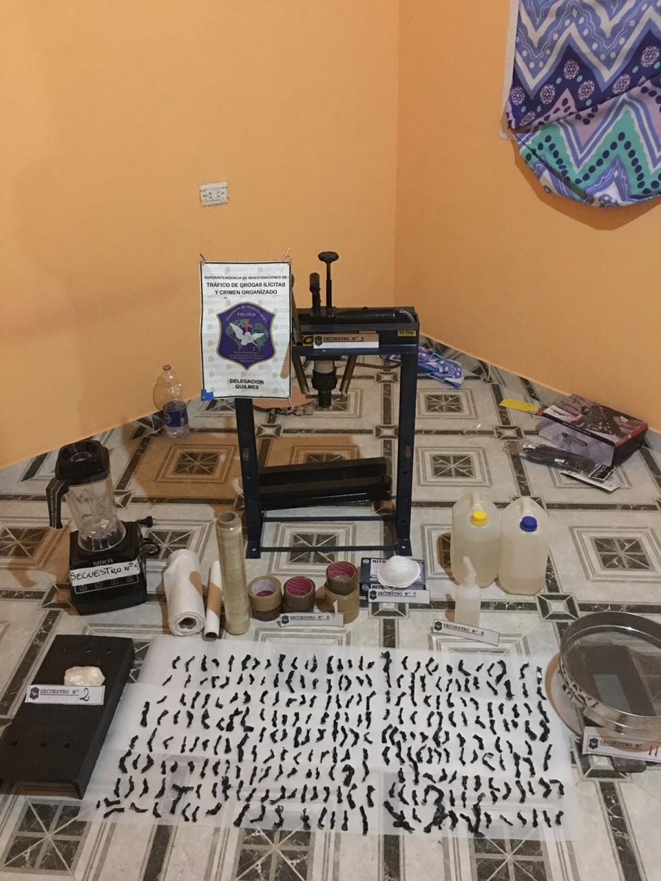 Durante los procedimientos, la Policía logró incautar una prensa hidráulica, precursores químicos, bidones de acetona y otras materias primas con la que se produce el estiramiento de la cocaína, guantes de látex, barbijos, coladores, tamizadores, cintas de embalar y varios elementos utilizados para la producción de la droga.