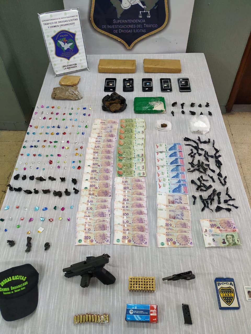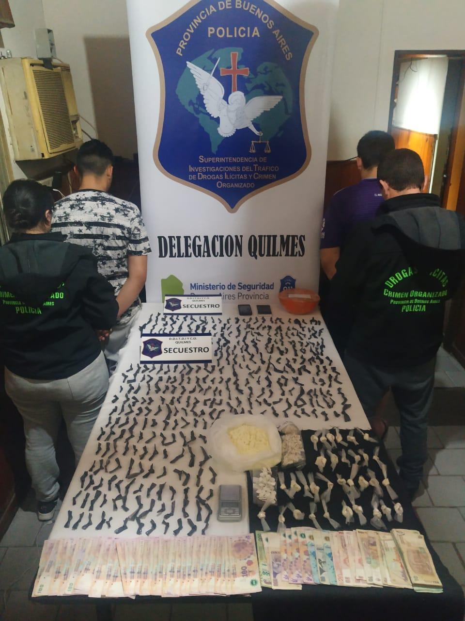 En los allanamientos, la policía incautó más de un kilo de cocaína, elementos de fraccionamiento, recortes de nylon, una balanza de precisión, dinero en efectivo y celulares, entre otros elementos. En total, hay cuatro detenidos, los mellizos de 22 años, más dos mujeres de 19 y 59 años. Intervienen la UFI N° 20 y el Juzgado de Garantías N° 3, ambos del Departamento Judicial de Quilmes.