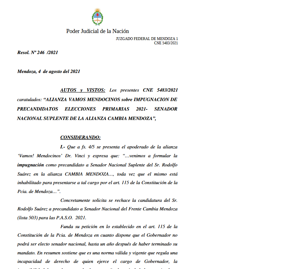 El primer mandatario había sido inscripto para ser senador nacional por el frente oficialista Cambia Mendoza y aunque muchos opinan que fue una jugada con el sello de su antecesor Alfredo Cornejo, el planteo judicial en contrario no tardó. El argumento de Vamos Mendocinos contra Suarez era claro: la precandidatura es ilegítima y está por fuera de la Constitución de Mendoza, que en su artículo 115  expresa: “El Gobernador no podrá ser electo senador nacional, hasta un año después de haber terminado su mandato”. Si de fechas se trata, el asunto es inapelable porque Suarez termina su mandato de gobernador en diciembre de 2023.