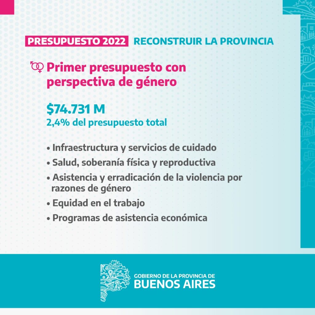 Por primera vez en la provincia de Buenos Aires se presentó hace unos días en la Legislatura bonaerense el presupuesto para el año 2022 que contempla la perspectiva de género. Según se indicó, fue un trabajo en el que intervinieron el Ministerio de Hacienda y Finanzas y el Ministerio de las Mujeres, Políticas de Género y Diversidad Sexual.