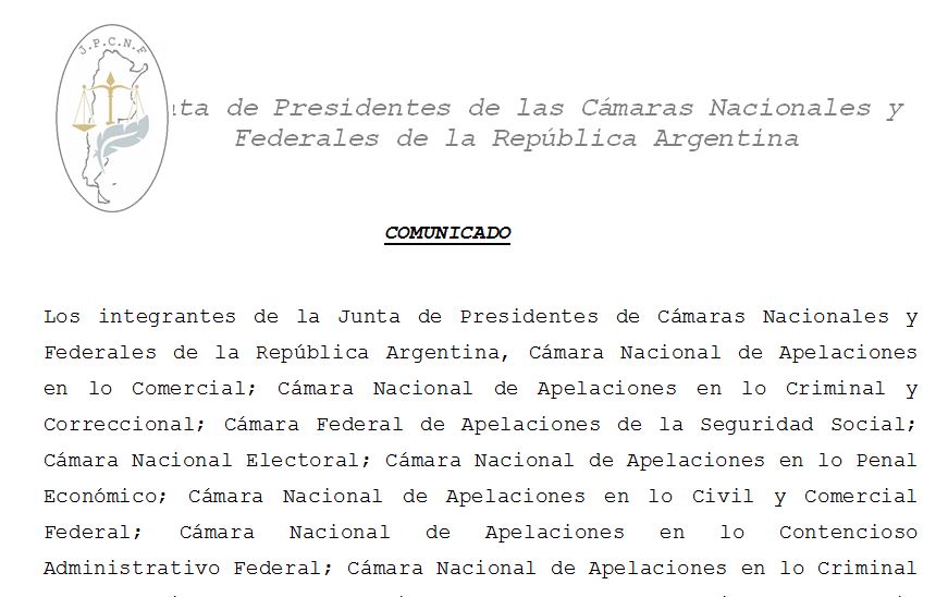 Ellos son la Junta de Presidentes de Cámaras Nacionales y Federales de la República Argentina, Cámara Nacional de Apelaciones en lo Comercial; Cámara Nacional de Apelaciones en lo Criminal y Correccional; Cámara Federal de Apelaciones de la Seguridad Social;  Cámara Nacional Electoral; Cámara Nacional de Apelaciones en lo Penal Económico; Cámara Nacional de Apelaciones en lo Civil y Comercial Federal; Cámara Nacional de Apelaciones en lo Contencioso Administrativo Federal; Cámara Nacional de Apelaciones en lo Criminal y Correccional Federal; Cámara Federal de Apelaciones de Bahía Blanca; Cámara Federal de Apelaciones de Comodoro Rivadavia; Cámara Federal de Apelaciones de Córdoba; Cámara Federal de Apelaciones de Corrientes; Cámara Federal de Apelaciones de General Roca; Cámara Federal de Apelaciones de Mar del Plata; Cámara Federal de Apelaciones de Mendoza; Cámara Federal de Apelaciones de Paraná; Cámara Federal de Apelaciones de Posadas; Cámara Federal de Apelaciones de Resistencia; Cámara Federal de Apelaciones de Salta; Cámara Federal de Apelaciones de San Martín y Cámara Federal de Apelaciones de Tucumán –por decisión unánime- y, la Cámara Nacional de Apelaciones del Trabajo; Cámara Nacional de Apelaciones en lo Civil; Cámara Federal de Casación Penal; Cámara Nacional de Casación en lo Criminal y Correccional de Capital Federal; Cámara Federal de Apelaciones de La Plata y la Cámara Federal de Apelaciones de Rosario –por decisión mayoritaria-.