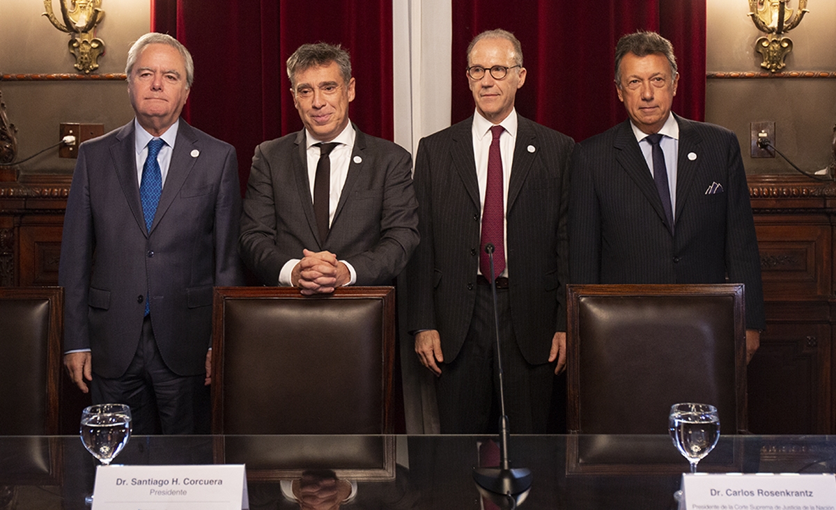 - El senador de Cambiemos, Federico Pinedo; el camarista Santiago Corcuera; el presidente de la CSJN, Carlos Rosenkrantz, y el camarista Alberto Dalla Vía. (Crédito CNE)