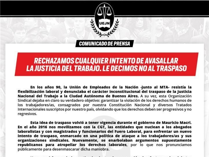En el documento, destacaron que “hoy, en el fragor de la contienda electoral y en ocasión de efectuarse los debates entre los candidatos, los hijos del poder económico vuelven a reflotar el anhelo de traspasar la Justicia Nacional del Trabajo al ámbito del CABA”, y afirmaron que “impulsan el traspaso para garantizar la flexibilización laboral”.