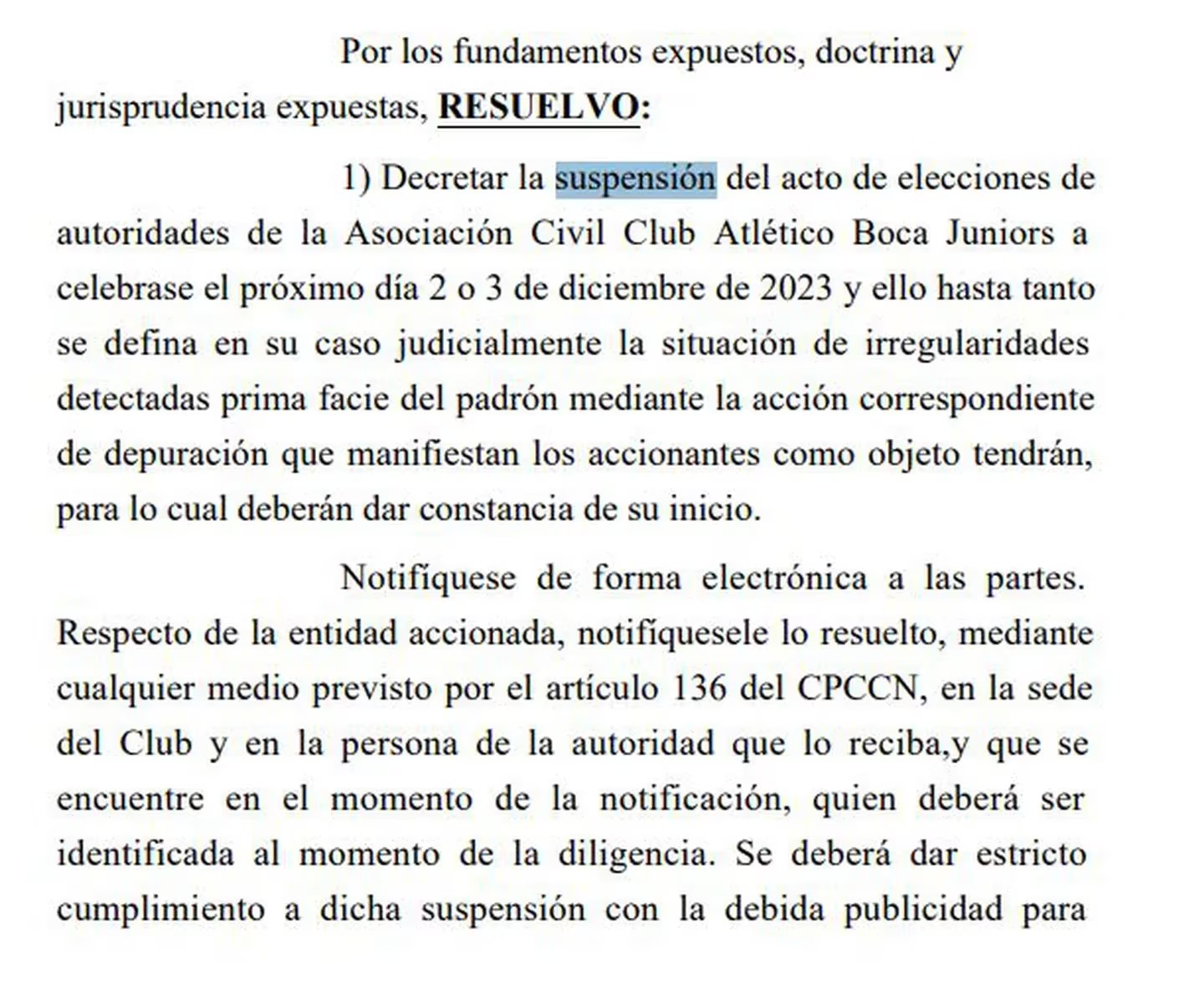 "La suspensión del acto de elecciones de autoridades de la Asociación Civil Club Atlético Boca Juniors a celebrase el próximo día 2 o 3 de diciembre de 2023 y ello hasta tanto se defina en su caso judicialmente la situación de irregularidades detectadas prima facie del padrón mediante la acción correspondiente de depuración que manifiestan los accionantes como objeto tendrán, para lo cual deberán dar constancia de su inicio", dijo la jueza quien abrió la discusión entre ambas listas por la cantidad de socios y socias nuevos habilitados para votar.