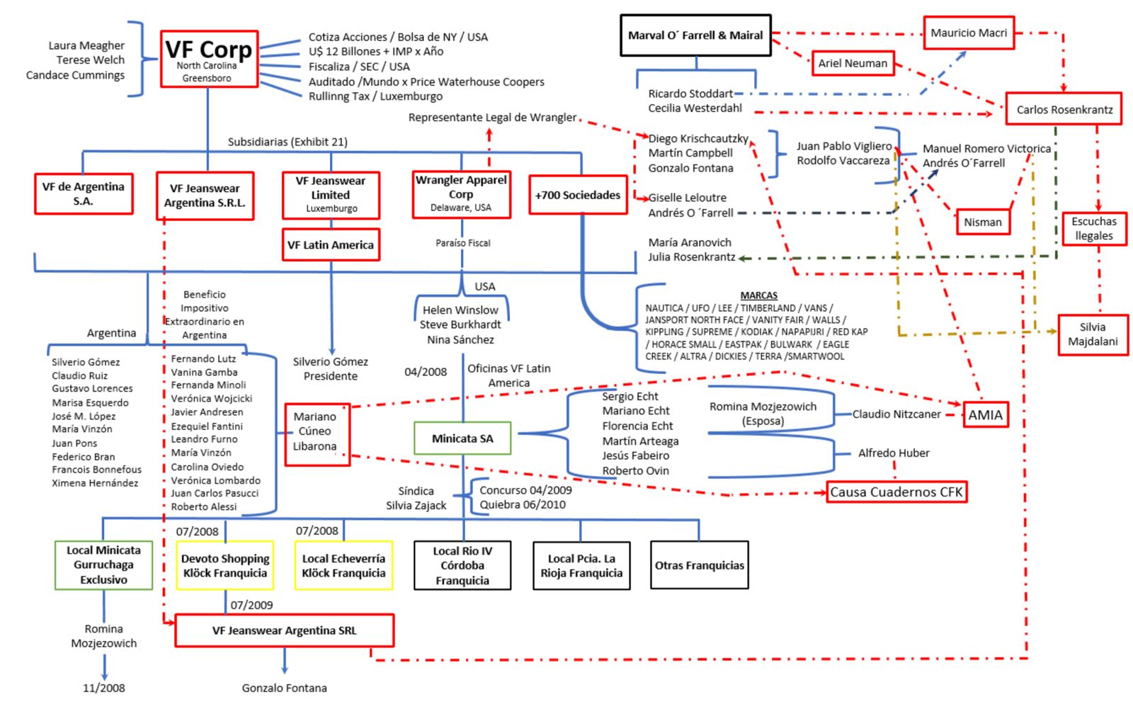 Se cierra la instrucción de la causa criminal iniciada en 2009 donde están englobados en una maraña de particulares, mandatarios de marca, concesionarias e intermediarios participes necesarios del delito de estafa, defraudación por debaratamiento y quiebra fraudulenta. Los procesados según los documentos a los que accedió este medio son acusados como participes necesarios en el juicio ante el TOC N° 29 son: Claudio Marcelo Ruiz, Herminia García Sanchez, Gustavo Mariano Lorences, como funcionarios del Grupo VF Corporation y Romina Paola Mojzeszowicz, cónyuge de Mariano Echt, socio y Director de Minicata S.A.