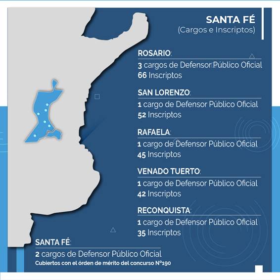 Es importante aclarar que para los dos cargos defensor y defensora pública oficial que la Ley 27.715 creó con asiento en la ciudad de Santa Fe se aplicó el orden de mérito que había sido obtenido en el Concurso Nº190 MPD, convocado oportunamente para cubrir el cargo vacante de defensor/a público/a oficial ante el Tribunal Oral en lo Criminal Federal de Santa Fe.