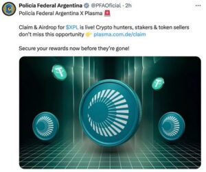 Los tres posteos, que estuvieron visibles más de dos horas, incluían videos e imágenes y promocionaban tokens como Plasma ($XPL) y Mira Network ($MIRA) con frases como: “¡El reclamo y lanzamiento aéreo por $XPL ya está disponible!”.