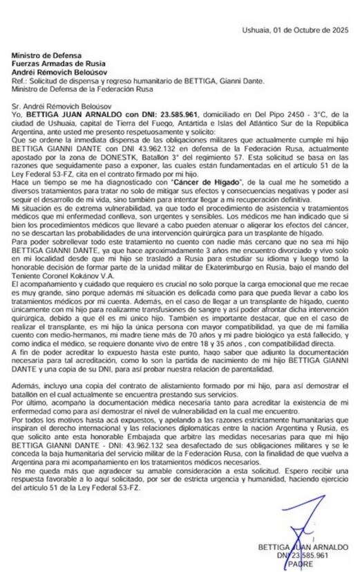 El padre presentó un pedido urgente al ministro de Defensa ruso, Andréi Beloúsov, solicitando que “ordene la inmediata dispensa de las obligaciones militares que actualmente cumple mi hijo en defensa de la Federación Rusa”. Adjuntó además su historia clínica para respaldar el pedido humanitario.